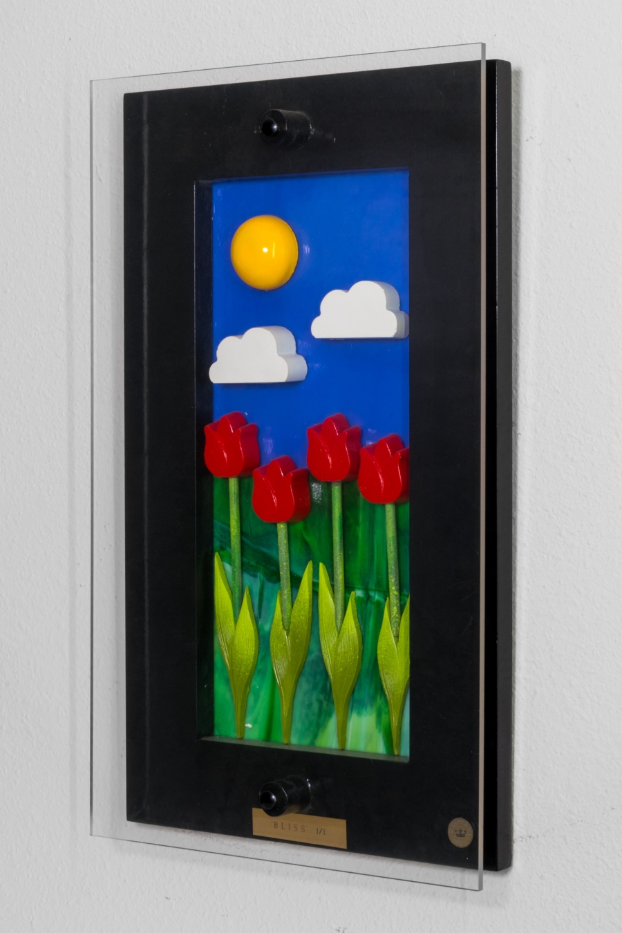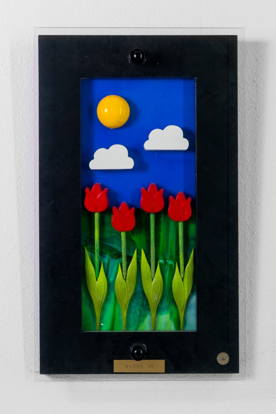It took weeks to secure the stained glass pieces that were the perfect colors to blend and at the same provide a dramatic background. The bright sun radiates and the tulips reaching to the sky.